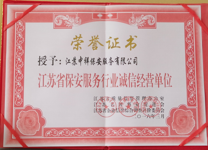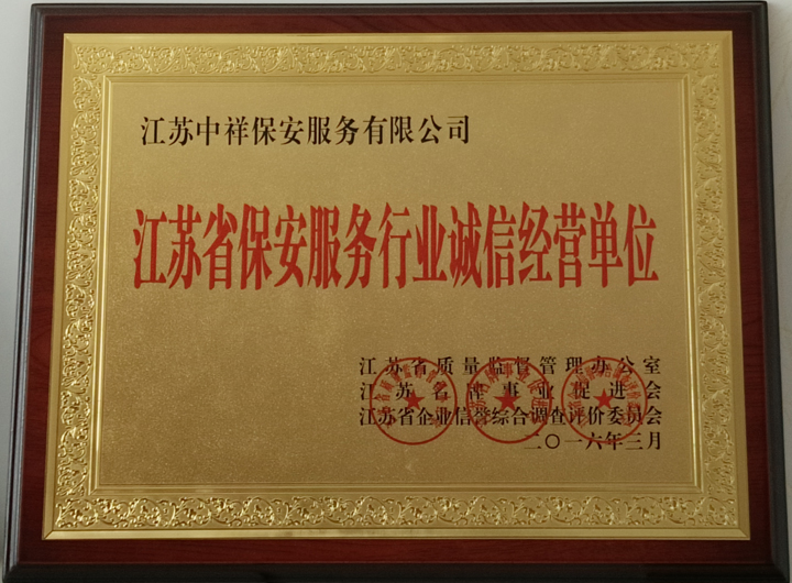 江蘇中祥保安公司榮獲江蘇省保安服務行業(yè)誠信經營單位